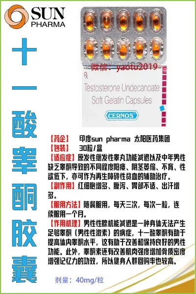 十一酸睾酮胶囊,印度仿制男性性激素补充治疗用药(睾酮素),处方药,主要用于男性睾酮缺乏症的替代补充治疗,口服剂型。由印度正规药厂生产,使用前必须由医师诊断并开具处方,不得自行购买或使用,内容仅供公开参考,不替代医师处方与医疗建议。本品由印度正规药厂生产,请在医师指导下使用,内容仅供参考。